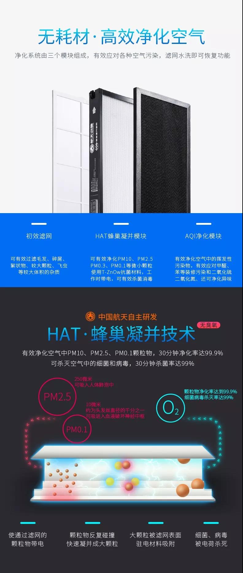 航天迅馳空氣凈化器為無耗材空氣凈化器,凈化效能超2016新國標3倍;CARD值(每小時凈化空氣量)335立方米/每小時(大);運用中國航天自主研發 HAT·蜂巢凝并技術,有效凈化空氣中PM10、PM2.5、PM0.1顆粒物,30分鐘凈化率達99.9% 可殺滅空氣中的細菌和病毒,30分鐘殺菌率99%。